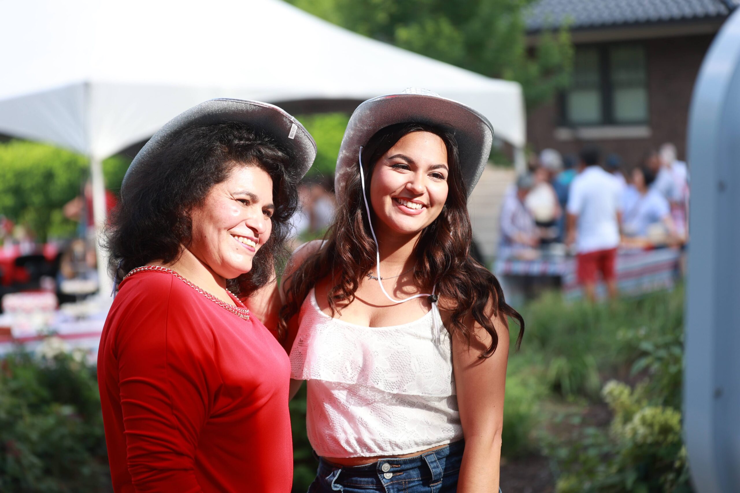 Mom putting on props for her daughter in front of photo booth stand