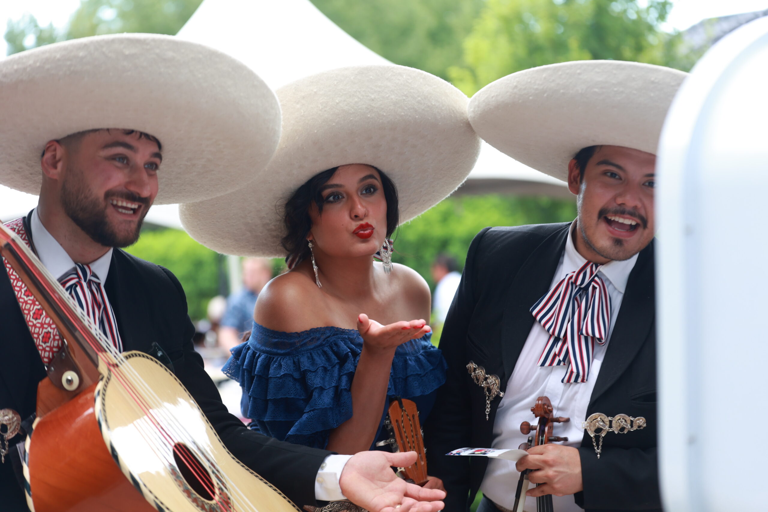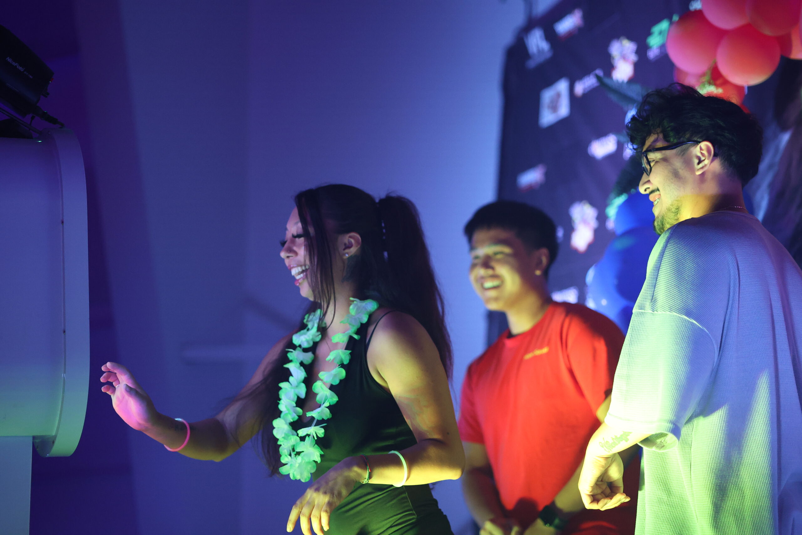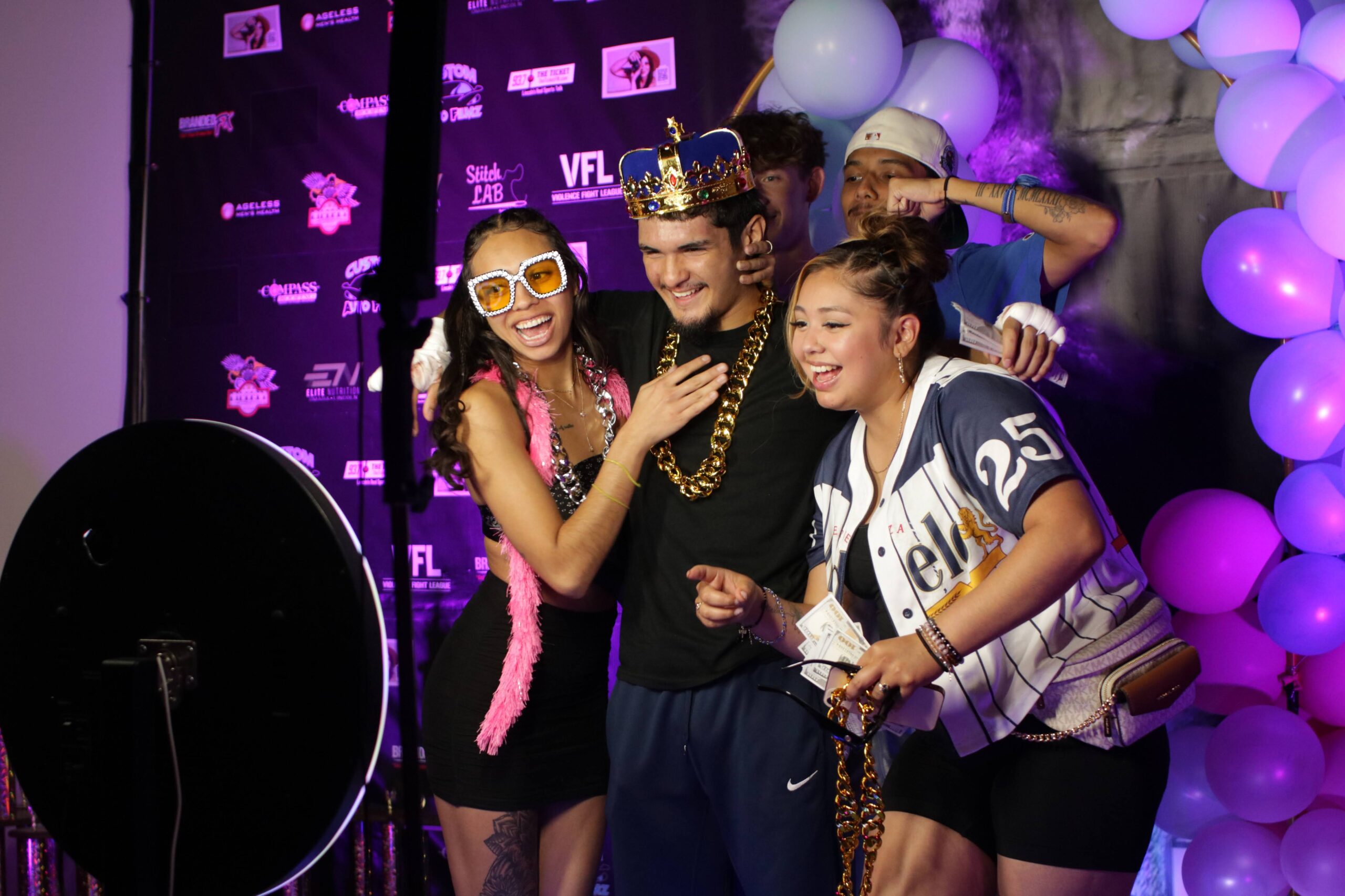 Group of hispanic friends posing and laughing in front of photo booth