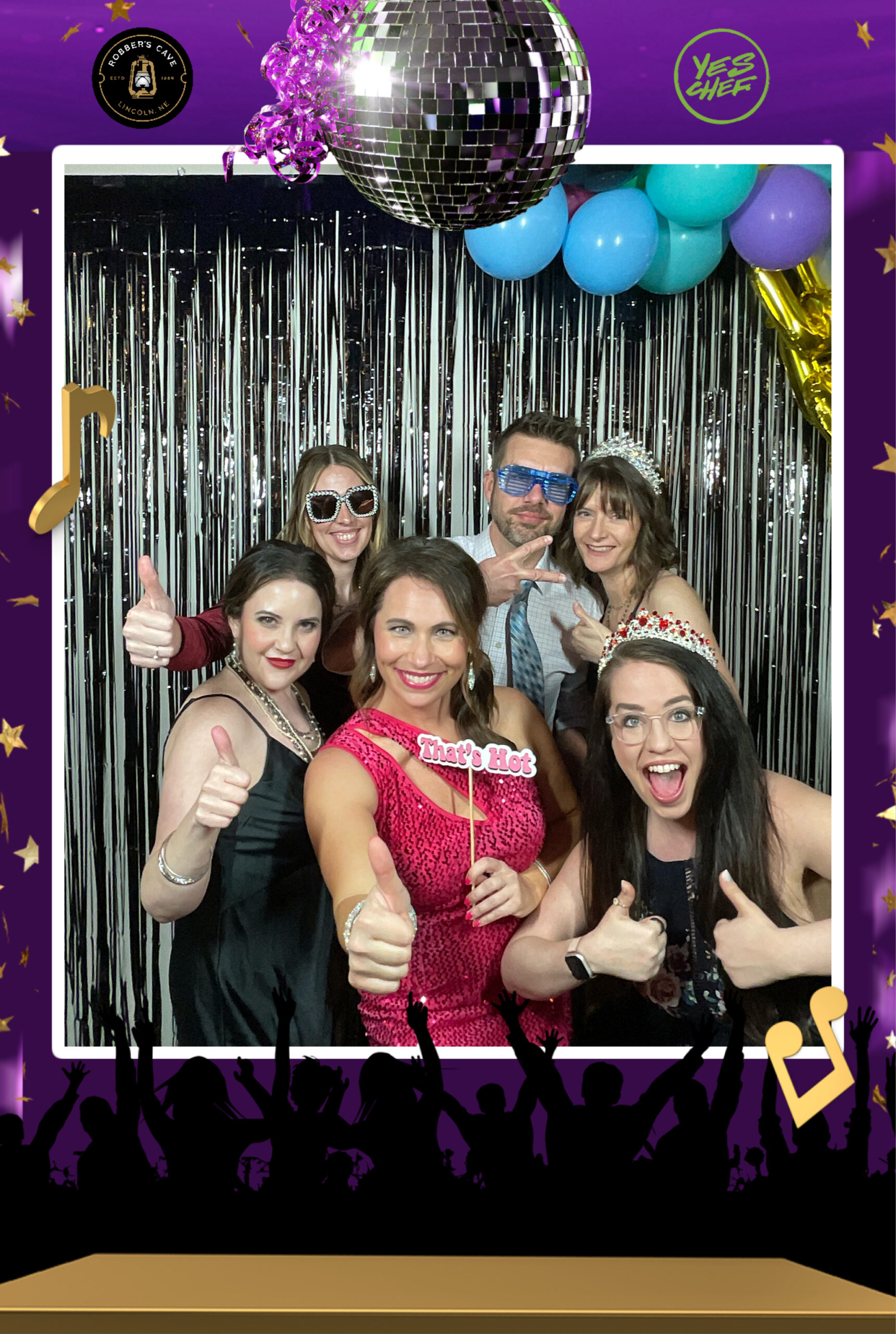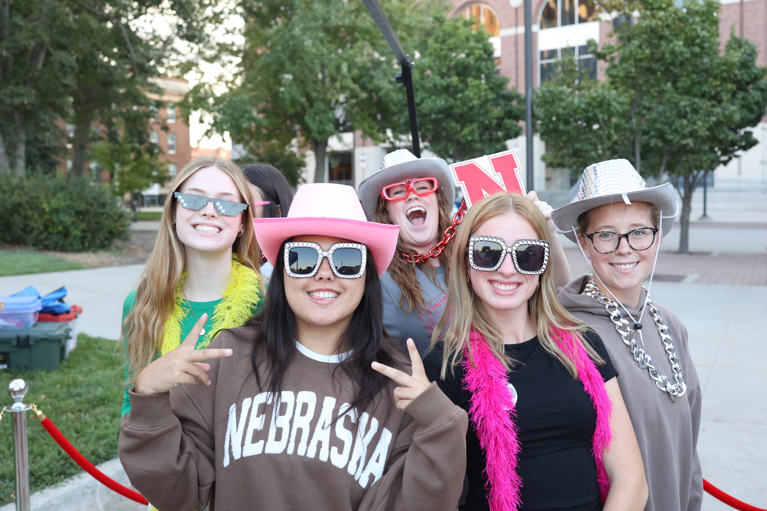 Group posing at photo booth with props