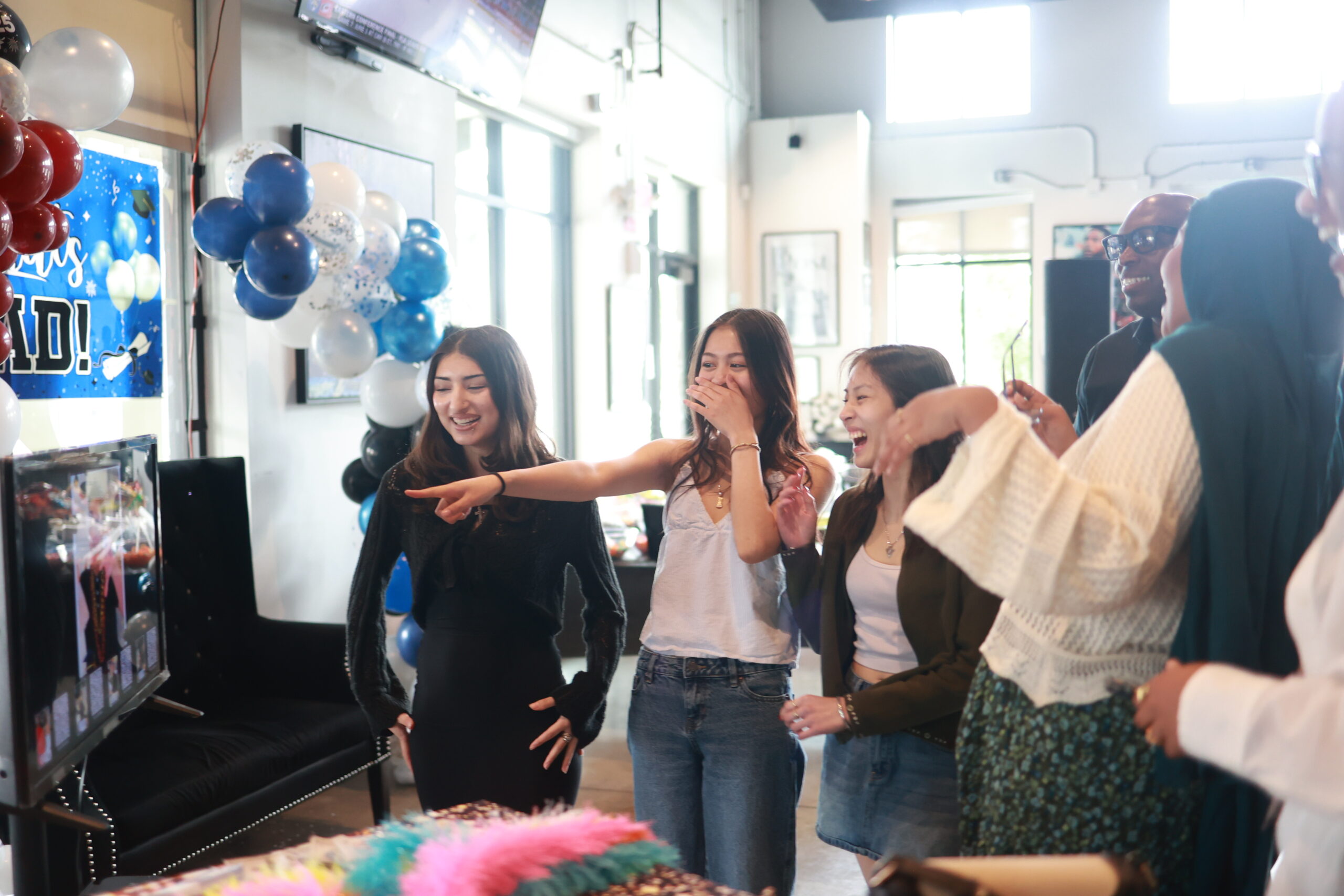 Young girls laughing at photo images and props